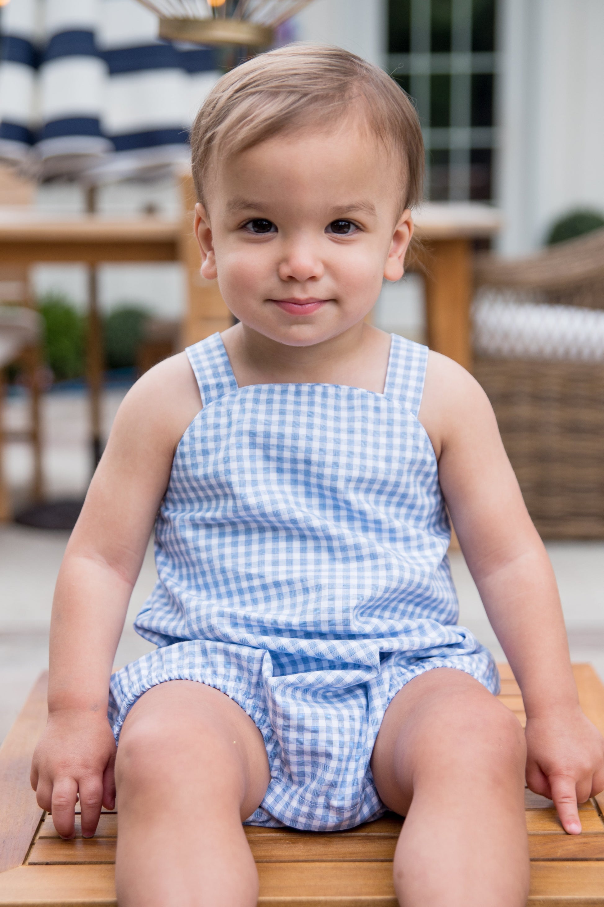Our Tighe Bubble in Blue Check features an adorable knot style for the back and is a fun new style for us this season. Your little boy is sure to look precious in this bubble this Summer!